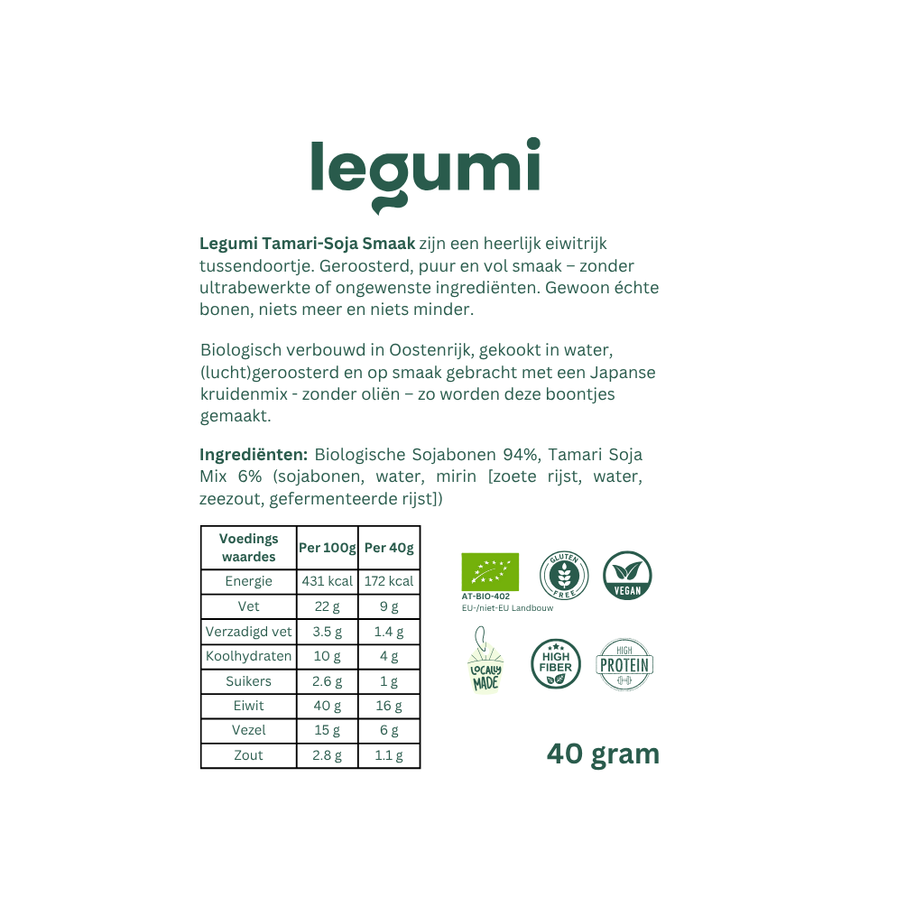 Legumi-snacks worden gemaakt van 100% biologische sojabonen, zonder kunstmatige toevoegingen of pesticiden. Doordat de bonen puur en minimaal bewerkt zijn, blijven hun natuurlijke voedingsstoffen behouden. De snacks zijn volledig plantaardig en dus geschikt voor een veganistische levensstijl. Legumi bewijst dat een verantwoorde keuze voor je lichaam ook goed kan smaken én beter is voor de planeet.